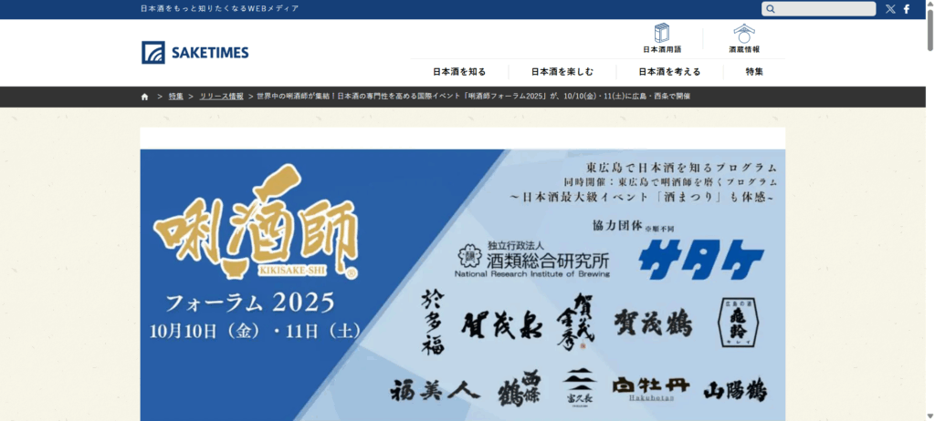 日本酒をもっと知りたくなるWEBメディア「SAKETIMES」で、「世界中の唎酒師が東広島に集結!「唎酒師フォーラム2025」」が紹介されました!